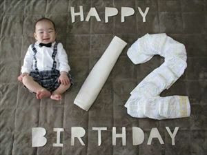 ・オムツを使って「/2」という部分だけ文字を作って、1の部分に赤ちゃんを寝かせて「1/2」という文字を作る
